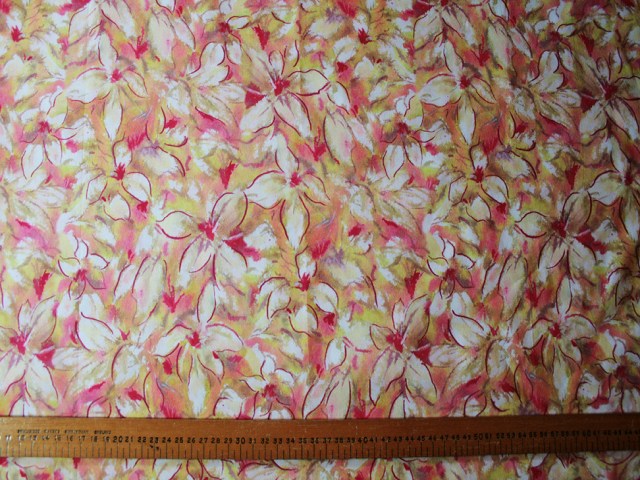 A beautiful quality soft cotton with an abstract floral design in warm citrus shades. A great choice for blouses and dresses. |
