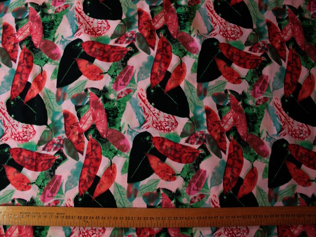 A vibrant, soft and drapey rayon (viscose) with a stunning design of abstract leaves. Gorgeous for flowing tops and dresses. |