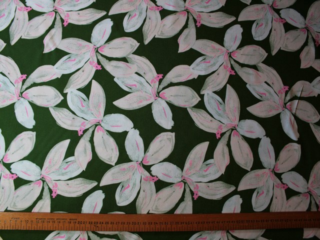 A vibrant, soft and drapey rayon (viscose) with a stunning design of abstract leaves. Gorgeous for flowing tops and dresses. |