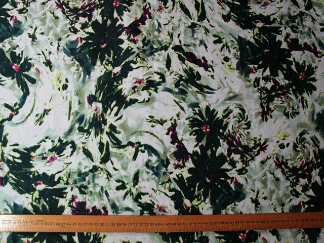 A top-quality linen/cotton blend with an abstract floral design. Beautiful strong shades of green with a splash of red for gorgeous tops and dresses. |