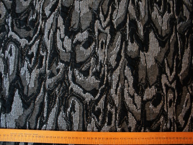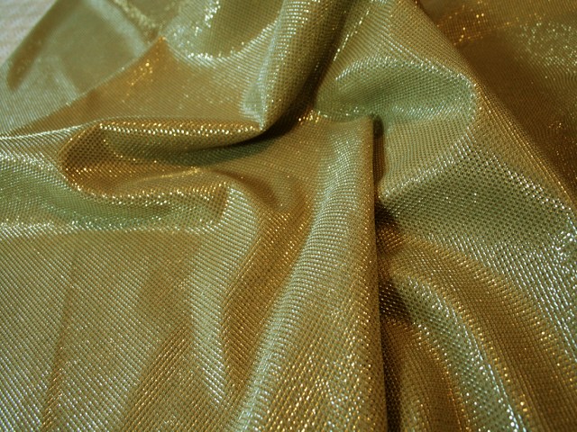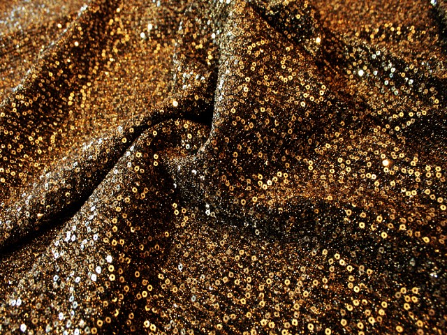 A super stretchy fine black jersey embossed with gold threads and tiny sequins. Perfect for a party top or special occasion dress. |