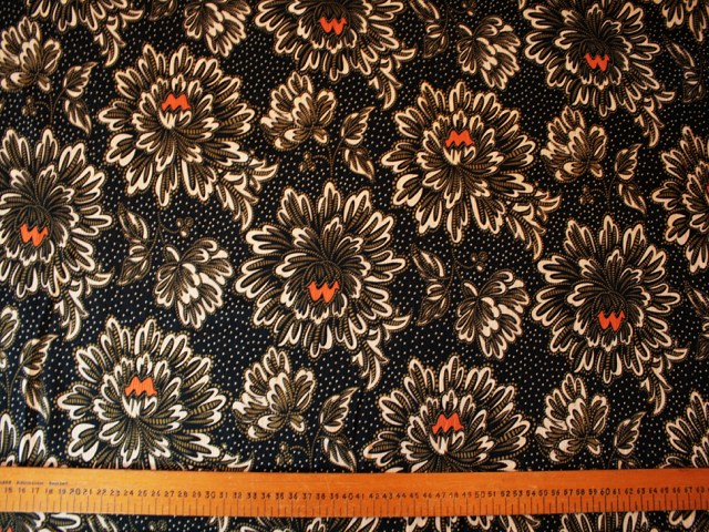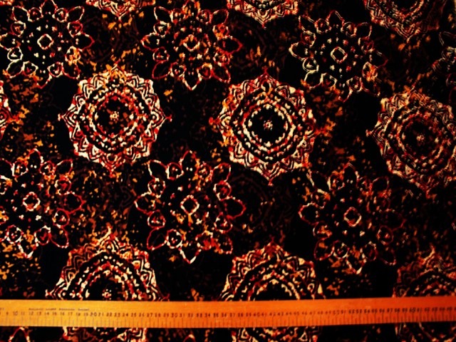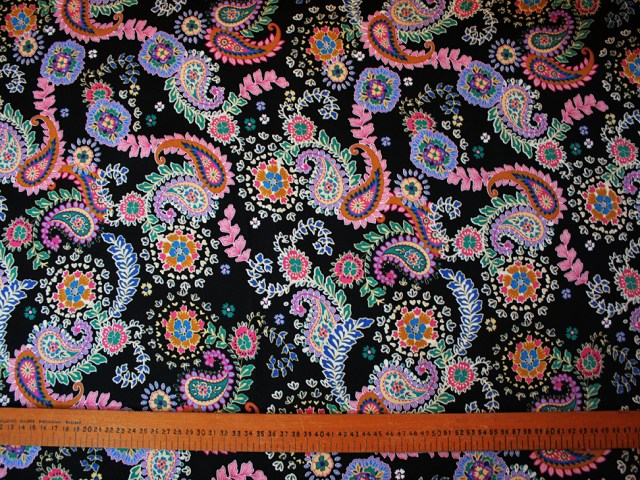 We love the multi "Day of The Dead" colours in a paisley design on this gorgeous drapey non-crease polyester. Vibrant for tops and dresses. |