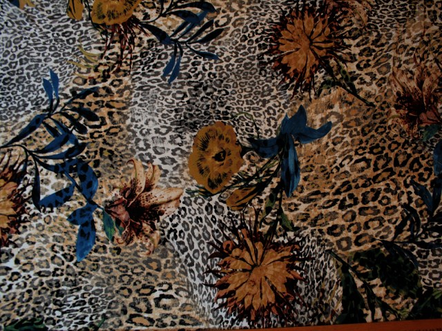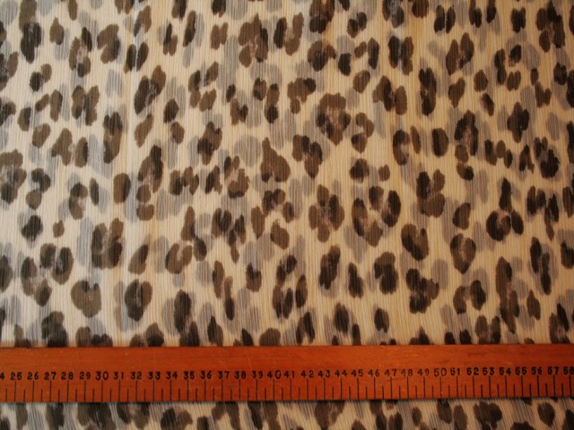 This is special - a fine sheer crinkle finish georgette in pure silk with a subtle leopard print. Beautiful for a ruffly blouse or floaty dress. |